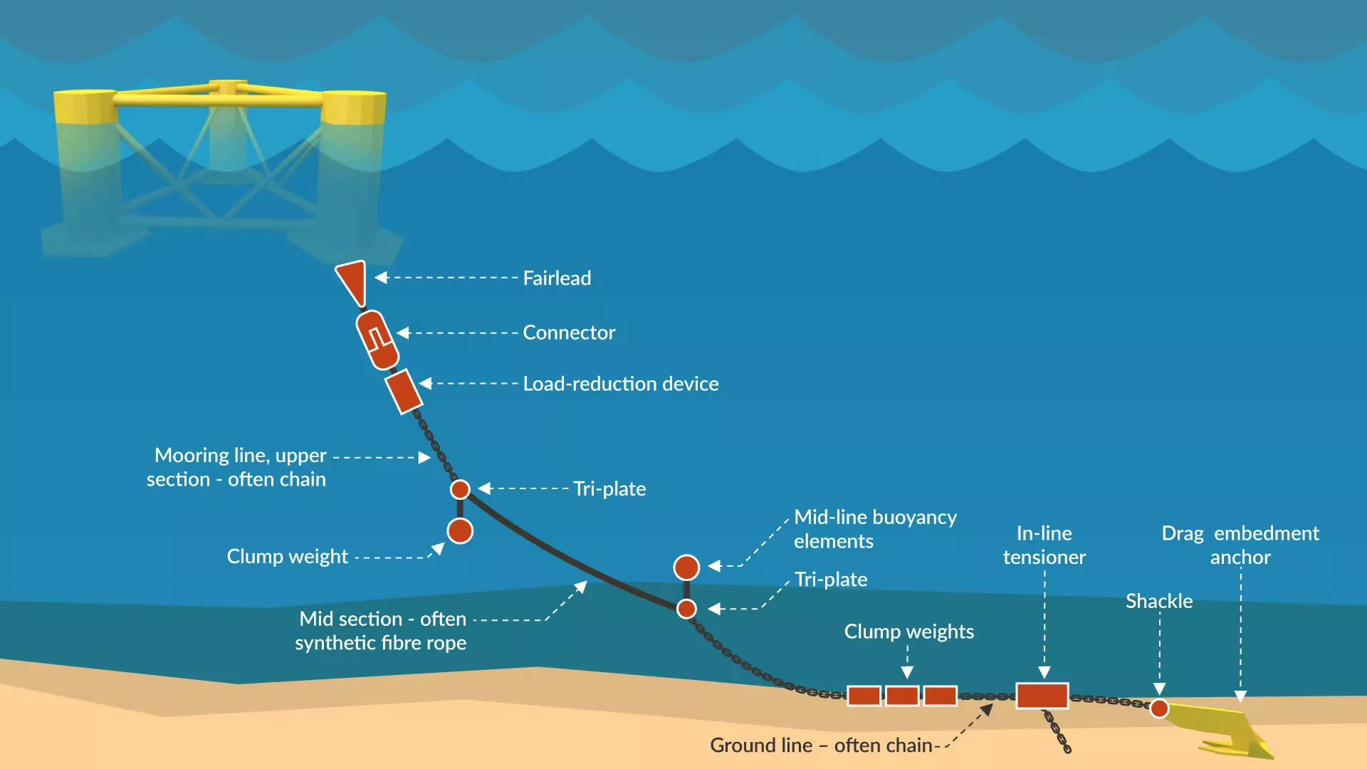 Mooring verwijst naar het verankeringssysteem dat wordt gebruikt om drijvende offshore constructies, zoals windturbines, platforms of meetboeien, aan de zeebodem te bevestigen. Het systeem bestaat meestal uit meerlijnen, kettingen of kabels die via verbindingscomponenten met de constructie zijn gekoppeld.