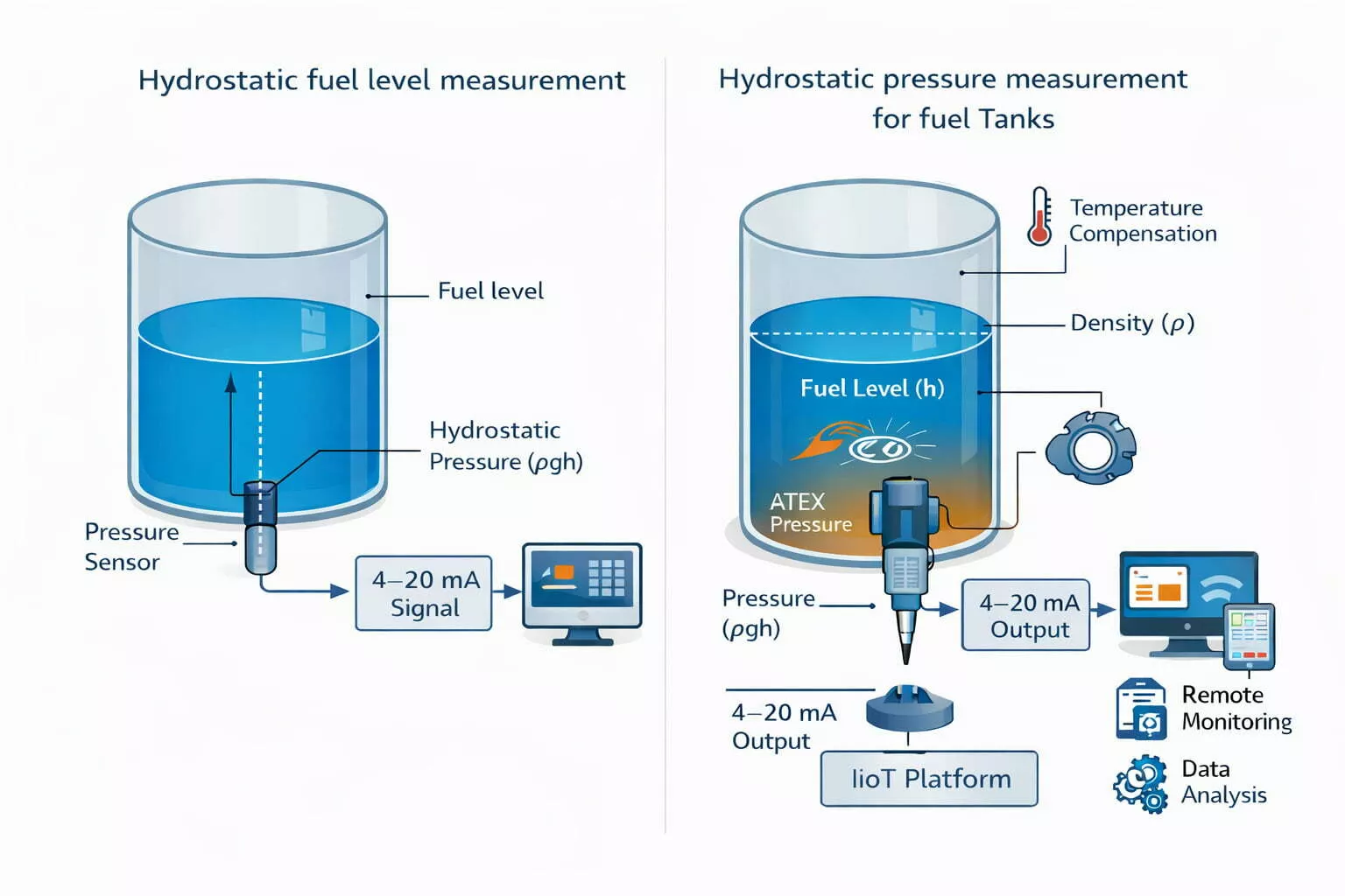 Hydrostatisk tryckmätning är en tillförlitlig metod för övervakning av bränslenivå i tankar. Metoden fungerar genom att mäta trycket som skapas av vätskekolumnen, vilket är direkt proportionellt mot fyllnadsnivån.